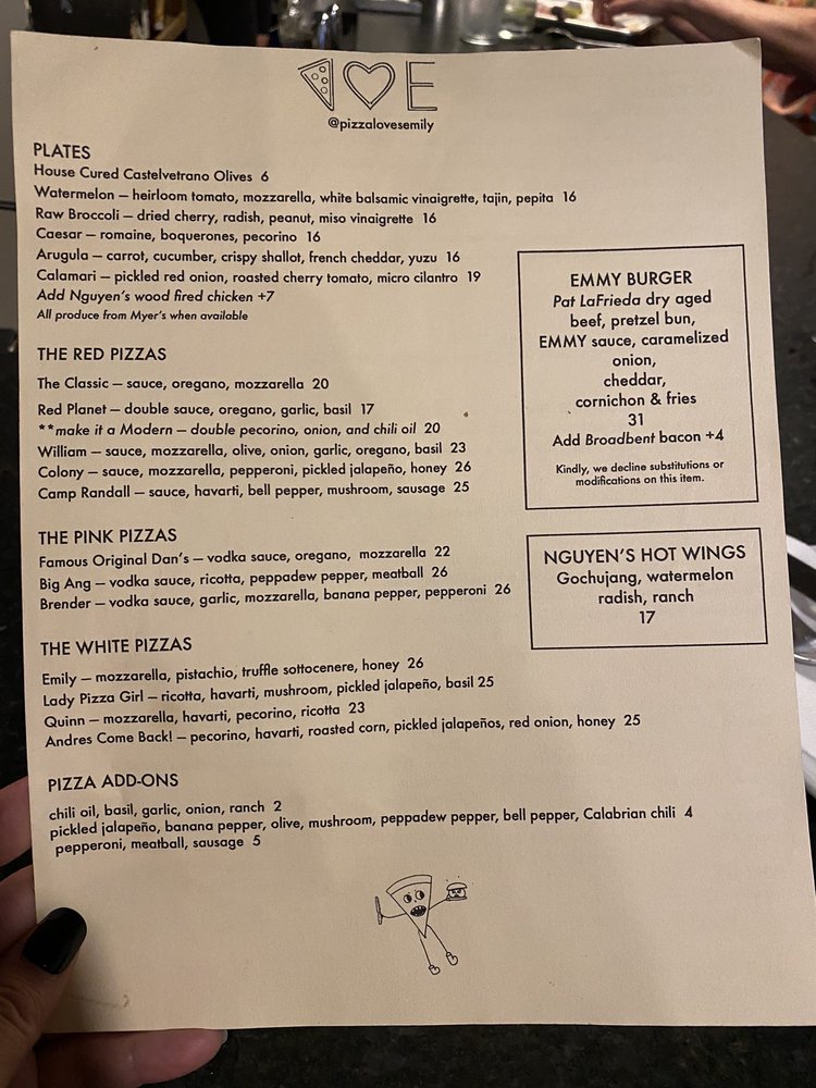 Located in Brooklyn, Emily offers a variety of American cuisine in a casual setting. With options for reservations, delivery, and takeout, Emily also features outdoor seating and a full bar. The menu boasts unique pizza creations like the Pink Pizza with Big Ang vodka sauce and meatball, or the Red Pizza with Camp Randall sauce and sausage. In addition to pizzas, Emily offers plates like Brussels Sprouts with bacon and Caesar salad with boquerones. Customers rave about the Emmy Burger, with its pretzel bun and caramelized onions, as well as the Raw Broccoli Salad with Asian pears and miso dressing. Overall, Emily impresses with its quality ingredients and diverse menu options, making it a must-visit spot in Brooklyn for delicious and satisfying meals.